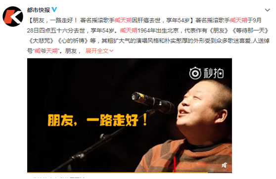 9月28日再传噩耗:中国第一代摇滚音乐人臧天朔因肝癌去世,享年54岁。他也是继著名演员傅彪、“肥姐”沈殿霞、作家魏巍后,又一位因肝癌去世的名人。