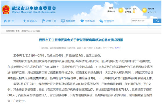 19日凌晨,武汉卫健委官网连发2条公告:1月17日,新增17例新型冠状病毒(世界卫生组织将其命名为“2019新型冠状病毒”,即2019-nCoV)感染的肺炎确诊病例,累计报告62例(前一日新增4例),已治愈出院19例,在治重症8例,死亡2例。
