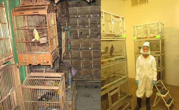 印尼活禽市场(左)和,生物安全3级实验室建立的禽流感病毒跨物种传播模拟市场(右)