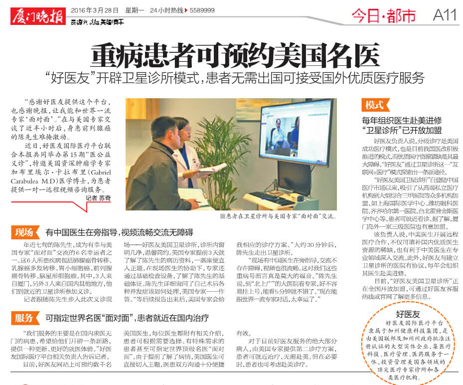 2016年3月厦门晚报以一篇题为《重病患者可预约美国名医——“好医友”开辟卫星诊所模式,患者无需出国可接受国外优质医疗服务》的文章对此进行了专题报道。