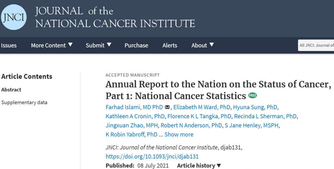 每年疾病控制与预防中心(CDC),北美中央癌症登记中心协会(NAACCR),美国癌症协会(ACS)和美国国家癌症研究所(NCI)都会联合发布《国家癌症数据年度报告》,提供美国癌症发生率和死亡率的数据更新。