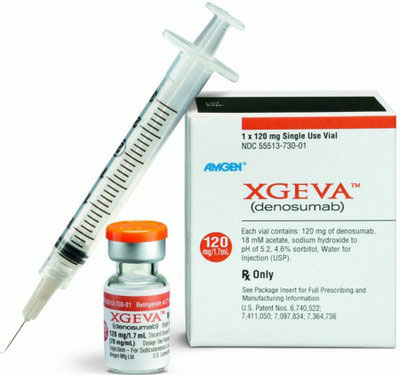 其中,地舒单抗(Denosumab)注射液是一种人免疫球蛋白 G2(IgG2)单克隆抗体,对 RANKL 具有高特异性和亲和性。在骨巨细胞瘤患者中,地舒单抗对肿瘤基质成分所分泌的RANKL的抑制,可显著减少或消除破骨细胞样肿瘤相关巨细胞。因此,骨质溶解减少,巨细胞肿瘤进展减慢,增生性基质被致密的非增生性、分化型编织新骨代替,从而改善临床结局。