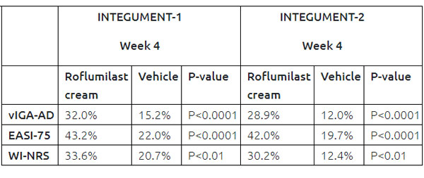 1、Roflumilast组有42%的患者达到EASI-75,安慰剂组为19.7%;