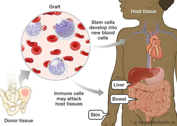异基因造血干细胞移植,是将一个人的造血干细胞植入另一个人体内,相当于把另一个人的免疫系统也一并移植了。如果双方能和平共处便可相安无事;如果不行,就会拼个你死我活,引起严重并发症——移植物抗宿主病。